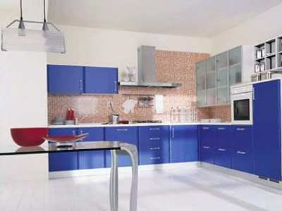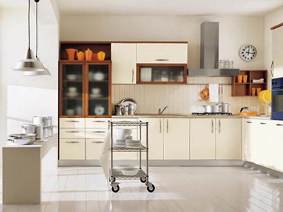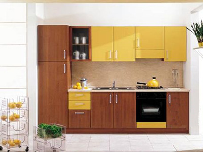 这款厨房以淡色为主,从中插入一些炫丽的黄色饰品,达到一种唯美的艺术效果。