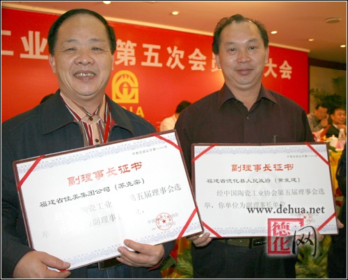中国陶瓷工业协会第五次会员代表大会十一月二十三日在海南省海口市召开,会议选举并通过了第五届中国陶瓷工业协会理事会,德化县人民政府助理调研员黄发建、佳美集团董事长苏尧棠当选为本届理事会副理长,德化的温克仁、苏建堆、林文智、颜清冷、颜真革、苏志勤、苏友谊、郑泽洽等八位同志当选为常务理事。