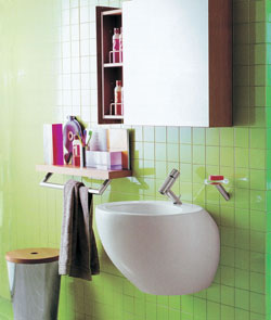鲜艳的颜色总是让人眼前一亮,翠绿的墙砖、地砖突出了卫生间设计的活力与热情。椭圆的白色洁具、不锈钢的龙头、皂托,表明了时尚与前卫。