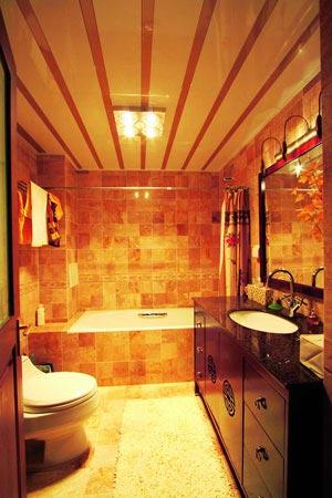 中式风格一直延伸到卫生间里,浴室柜上依然是古色古香的锁扣和雕花的图案,搭配镜子的边框和射灯,与现代的卫浴设施很好地融为一体。内嵌式的浴缸在增加空间层次的同时也缩短了空间的狭长感。设计师采用了花色的瓷砖,在灯光下营造出温暖轻松的环境。