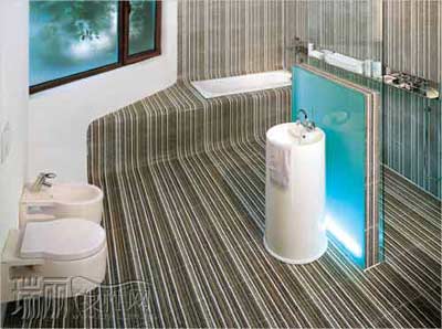 一眼看上去,整个浴室给人以个性而前卫的第一感觉,这恐怕要归功于一件件如同个性符号般的洁具、大面积铺贴能够形成条纹效果的马赛克、在洗面盆前设立矮墙及用灯衬托等有新意的物品和装修方法。