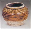 吉州窑还烧造黄釉瓷。主要器型是三乳足鼎炉、炉壁压印有凸瓣牡丹或水波纹样。