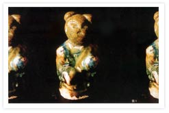 唐三彩乐伎(残,头部修复)(图1)。高8厘米。乐伎双手击鼓呈表演状。白胎。蓝、绿、黄棕四色釉,其中蓝釉成色纯正蓝艳。