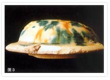 唐三彩(罐)盖残片(图3)。尺寸为8厘米×5.5厘米。土黄胎略泛红。蓝、黄彩。釉下钴蓝点彩,成色青雅明快,晕散。