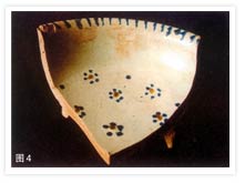 唐钴蓝点彩梅花纹饰残片(图4)。残片大约是原碗的五分之二,有天有地,据此可推算出原碗的大小:高6.5厘米,口径15.5厘米,足径9厘米。敞口、鼓腹、圈足。胎色泛黄。口沿以钴蓝点彩,呈带状;碗心以钴蓝点为瓣,棕黄色点为蕊,组成梅花状纹饰。钴蓝成色青蓝,晕散。