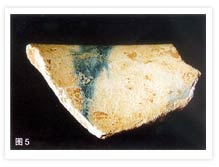 唐钴蓝点彩碗口沿残片(图5)。尺寸为5厘米×3厘米。白胎。釉下钴蓝点彩,钴蓝成色翠蓝,晕散。