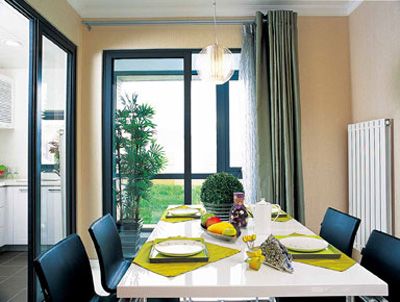 白色的餐桌、深色的餐椅、草绿色的餐垫,餐厅现在的整体感觉比较偏清冷,尤其是在冬天,会让人觉得很没有烟火气。