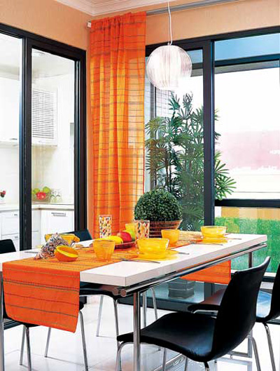 将原有的绿色窗帘和餐垫,替换成大面积温暖丰富的橙色,打破了沉闷。