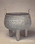 哥窑 宋代五大名窑之一,在浙江龙泉。烧制的青瓷有各式碗、盘、瓶、炉等,,典型器物有琮式瓶、贯耳瓶、鬲式炉、莲瓣碗等。有的器物有刻划、堆塑等装饰,哥窑瓷采用多次施釉的工艺,使青釉浓厚青翠,色彩幽深,创出了粉青、梅子青等绝顶釉色,把青瓷的美,推到了一个新的境界。哥窑青瓷釉上有细碎的开片,称作“百圾碎”,更小的叫“鱼子纹”,把原本是缺陷的开片变成瓷器表面自然天成的装饰,说明工匠们已经掌握了开片的规律,可以人为地加以控制和利用,这只有在制瓷工艺达到高峰的宋代才能做到。