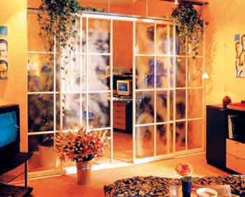 这个小茶室采用现在很流行的和室设计,方几、方垫、绿竹、插花搭配在一起,形成很温馨的女性空间。为保持环境的通透与女主人对阳光的追求,设计师利用了天井上方全透明的玻璃屋顶,在楼梯一侧设计了大大的几何图形镂空造型,这些都保证了这一方和室的光线。