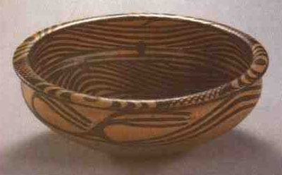 新石器时代马家窑文化马家窑类型的陶器,年代为公元前3100至前2700年,因最早发现于甘肃临洮马家窑而得名,直接由石岭下类型发展而来。马家窑氏族经济中制陶手工业发达,工艺水平很高,生产的陶器可分为泥质红陶、夹砂红陶、泥质灰陶等陶系。夹砂红陶主要作炊器和盛储器,在成型时表面做出绳纹、附加堆纹。泥质陶种类多,在生活中使用广泛,有素面磨光陶,也有彩陶。马家窑类型的彩陶最精美,陶器细腻,底色呈橙黄色,少数呈砖红色,表面打磨光亮,大多数用黑彩在器物的口沿、颈腹最圆鼓的部位和内壁绘画装饰。纹饰以几何形图案为主,构图饱满复杂,出现最多的有垂幛纹、垂钩纹、圆点纹、波浪纹、平行条纹、弧线三角纹、叶状纹间网纹、葫芦形纹、菱形网纹、螺旋纹、圆圈纹、S形纹等。人物类画面最精采的是红陶盆内壁5人一组携手舞蹈的纹饰,它是研究新石器时代舞蹈艺术和氏族成员娱乐生活、风俗人情的宝贵资料。动物纹饰有变形鸟纹、狗纹等。马家窑类型遗址发现有规模很大的制陶作坊,生产的器物有碗、钵、盆、瓶、壶、罐、甑、瓮、带嘴锅。还有上部为泥质陶彩绘、下部为夹砂耐火粗陶的器物,如盆、罐、带嘴锅相结合的器物,适应人们日益丰富、广泛的生活需要,表现了工艺的娴熟和生产安排的灵活性。(见下图)