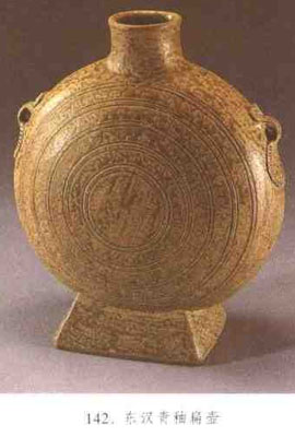 壶式之—,特征是壶身扁平,肩腹部有系,便于穿绳提携。瓷质带系扁壶出现于东汉时期,是仿铜器形状制作的。1986年浙江余杭反由出土的东汉青釉扁壶,为圆唇口,直颈,扁腹,长方形足外撇,上腹两侧有对称的衔环耳。西晋时壶体呈丰唇,直口,短颈,圆肩,肩部两侧各贴塑带翼鼠为系,壶腹扁圆,圈足为椭圆状。南北朝、唐、五代时期出现了一种带西域风格的扁壶。如1971年河南安阳北齐武平六年(575年)范粹墓出土黄釉瓷扁壶,敞口,短颈,肩两侧各有一带孔凸起为系。壶体扁圆,上窄下宽似核桃状,底部假圈足,扁腹两面印有胡人舞蹈图案。与此相似的扁壶还有唐三彩制品,所不同的仅是纹饰上的变化。辽宁省博物馆收藏辽暗黄釉印花穿带扁壶则带有北方游牧民族的特征,长方形口,短颈,扁圆形壶体,椭圆形圈足,周边有凹沟,共有6个系。与之相似的扁壶,在内蒙古和林格尔晚唐墓中也有发现。收藏于宁夏海原县文化馆的褐釉扁壶、蘑菇形口,短粗颈,壶体扁圆,周围有四系。元代四系扁壶,唇口外卷,短颈,溜肩、装有四系、腹侧垂直,腹面平,长条状平底,造型风格与前朝完全不同,烧造地点有景德镇窑、龙泉窑、磁州窑。综上所述可以看出,带系扁壶名称相同,然而由于历史时代不同,形状各有差异,各个时期都反映了浓厚的时代特征。(见图142)