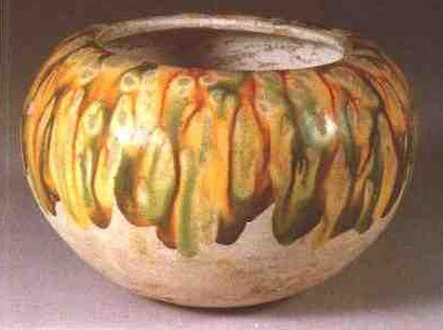 x 简称唐三彩,唐代(618~907年)生产的用高岭土作胎,施黄、绿、蓝、褐等多种色釉烧制而成的低温釉陶器物。唐三彩是利用矿物质中的金属氧化物的呈色机理烧制而成的,以氧化铅为助熔剂,在釉科中适量加入铜、铁、钴、锰等物质作着色剂,在900℃温度中铜的氧化物呈现绿色,铁的氧化物呈黄或黄褐色,钴的氧化物呈现蓝色,锰的氧化物呈现紫黑色。在这些釉色的基础上又成功地烧制出橙黄、深绿、赭色、茄紫等色彩,反映出唐代多彩陶器是在单彩陶器的基础上发展而来的。唐三彩始烧于唐高宗时期,玄宗开元、天宝年间是三彩器发展的顶峰时期,这时三彩种类繁多。造型生动优美,釉色绚丽多彩、在长安、洛阳的唐墓中出土最多,江苏扬州、山西、河南、甘肃也有出土。天宝之后三彩器逐渐减少,唐晚期三彩器几乎被瓷器所取代。唐三彩的制作工序如下;一、选料,三彩器很注重造型和釉色,因此对胎料选择不精,胎质中含有石英颗粒等杂质。二、成型,用模制或轮制及捏塑粘接的方法成型、为掩盖胎质精糙,突出釉色,往往成型后再罩化妆土。三、素烧,将阴干的坯胎用1000℃左右的温度烧坚。四、挂釉,按事前所设计的图案调配釉料上釉。五、低温烧釉,各色釉药在900℃温度烧造过程中,釉汁熔融流动相互浸润形成斑斓的色彩。六、开相,在不着釉的陶俑头部以朱涂唇、以墨画出眉毛、眼睛、头发,增强陶俑形态的神韵。唐代盛行厚葬,大小唐墓中出土三彩器甚多,反映出唐代社会生活的方方面面。根据已发表考古资料分析,唐三彩的器物类别,如生活用品,主要有瓶、壶、罐、钵、杯、盘、盂、烛台、砚、枕等;模型,有亭台楼榭、仿木箱柜、住房、仓库、厕所、牛、马车等;俑,有各种人物与动物,如贵妇、达官、男女侍、武士、天王、胡人及马、骆驼、猪、羊、鸡、狗等。唐代陶塑艺术成功之作也多表现于三彩作品中。如西安郊区鲜于庭诲墓出土的三彩骆驼载乐舞俑,是唐三彩中的佼佼者,造型独特,釉色绚丽,人物形态逼真,是难得的稀世珍宝。公元8世纪,唐三彩作为—种商品与越窑青瓷、邢窑白瓷一并通过海上丝绸之路运往亚非各国,在印度尼西亚、朝鲜、日本、埃及等国家都出土有唐三彩。9~10世纪朝鲜、日本、埃及等国也在唐三彩的启发下成功地烧出了具有本国特色的精美低温彩釉陶器如新罗三彩、奈良三彩等。(见下图)
