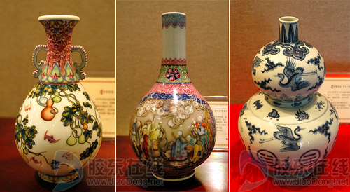 展出的台北故宫馆藏国宝高仿品 左起:仿清乾隆珐琅彩福寿双耳瓶、仿清乾隆珐琅彩锦地开光十八罗汉图胆瓶、仿明成化青花八卦飞鹤葫芦瓶 本网记者 李刚/摄
