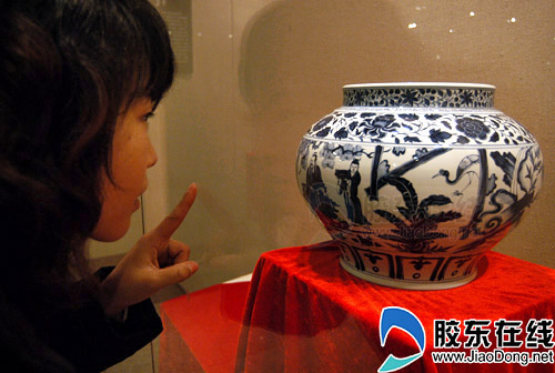 一女孩被仿元青花三顾茅庐罐吸引 本网记者 李刚/摄