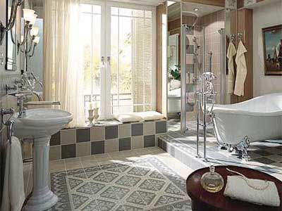 典型的乡村休闲的卫浴空间。仿古磨边表面的墙砖、遍野薰衣草的泥土色泽,都呈现自然粗糙的纹理和颜色,自然但绝不简陋。