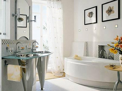 彩色的感官主义风格为年轻的现代女孩们量身定做了一个充满奇思妙想的卫浴空间。条纹的花砖流露着男孩的阳刚之气,而两边绚出的彩色恰恰是竖条花砖上的颜色,当这种颜色一旦独立出来就显得妩媚动人,充满女性色彩。对应这种感觉,所有的洁具造型均是柔和的圆形,而五金龙头花洒全部是充满男性色彩的不锈钢材质加方形造型,使得房间所有的颜色和物品在对比中统一与融合,满足年轻一族在经济上的需求。绚丽缎带般的墙面与彩色地面自然衔接和大面积的洁白墙面形成强烈的视觉感官冲击,犹如雨后天空的彩虹把人带入一个新的空间领域。