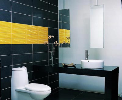 视觉的享受更多的来自于色彩和线条的和谐搭配,瓷砖是卫浴空间中色彩和线条舞动的最大载体。在暗色瓷砖中横向加入一条明黄色花砖,小空间的沉闷感立刻一扫而光。花砖表面凸起的斜纹,不仅打破衡平竖直的线性关系,还使得墙面充满张力。色彩的对比与线条的对比,是使小卫浴看起来时尚而有设计感的关键。