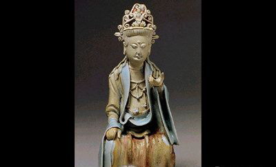 观音作坐势。头戴宝冠,以结跏坐于莲座之上,身着广袖低领外衣,坦胸,面目丰腴,耳后有长发披于肩。手指细长。左手下垂抚于膝,右手上举,做说法状。瓷质细白坚致。大部露台素烧,仅在衣襟、袖口、胸前等处施青白釉,釉色淡青,聚釉处为水绿色。在露胎的宝冠、衣裙等处饰以绿彩。惜大部以剥落。塑像底部有墨书题记,楷书"大宋淳祐二十一年辛亥"(公元1251年)九字清晰可辨。