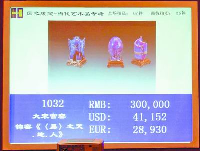 人民网河南视窗讯  大河网—大河报报道:昨日上午,在北京嘉里中心酒店二楼举办的翰海2007秋季拍卖会上,短短的40秒内,两位神秘买家轮番竞价,随着拍卖槌“当”声落定,拍卖师宣布我省参加拍卖的大宋官窑钧瓷《〈易〉天·地·人》系列作品以35.3万元成交,创下钧瓷当代工艺作品的最高拍卖价。