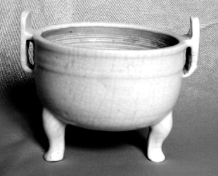 元枢府瓷香炉,高8.8厘米,直径11厘米,炉内深4厘米,露胎不施釉,有轮制痕迹,一圈一圈,十分清晰,略带点桔红色。胎体轻薄,造型精巧,贴一对精致的长条竖耳,腹上部刻有两圈凹弦纹,弧形收腹,平底,炉的底心不施釉,还有紫红色垫烧的印痕,留有手工刮坯的痕迹。通体施乳白釉,色泽近似鹅蛋白,肥腴敦厚,滋润均匀,釉面自然开片,发现多处缩釉点,同影青瓷不同,没有透明的感觉,大方自然。下安三只兽蹄形足,足底也施釉,这比较少见,器型平稳规整。