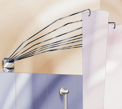 浴帘。非常有创意,是用几根铁丝做成伞骨一样的拉杆挂上浴帘,拉开就像半把伞,正好罩住淋浴范围,不会溅湿旁边木台上的东西。