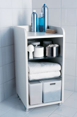 带滚轮的低矮浴室柜,可以装上各种洗浴用品和换洗衣服方便地推到浴缸前。