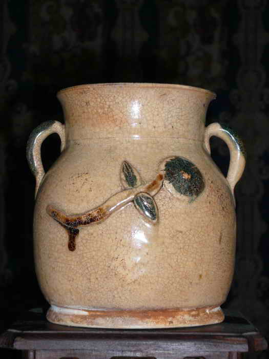 地处安徽省西南、长江中下游北岸的安庆地区,墓葬中时有长沙窑器物出土,品种有壶、罐、碗、玩具等等。这是怀宁县一唐代墓葬中出土的一件长沙窑褐绿彩双系罐。此双系罐高18.5厘米,口径15厘米,腹径17.5厘米,直颈,口沿外侈,窄肩,直腹,底部内凹,肩贴双系,双系两面用褐绿彩点绘相似的斜方形状图案纹饰,斜方纹内用绿彩点绘波浪纹。整件器物形体大方,修胎规整,釉层莹润光滑;为衬托出彩料的成色,达到其彩绘美的效果,器物胎上涂有一层化妆土,起到了增强胎体的致密度和增加瓷胎白度的作用;同时纹饰采用点、线表现手法,水墨晕散效果的抽象图纹,给人以丰富的想像空间。是一件难得的唐代长沙窑珍品,2004年安徽省文物鉴定站鉴定为国家二级文物,现收藏于怀宁县文物管理所。