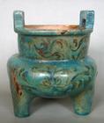器物的胎体多叶砖红色,宋代为繁荣时期,其中黄釉绿彩中比较突出的有大盆,盆里中心刻双鱼纹,两鱼逆水并游,辅以水草,线条自然流畅。褐釉器有鸭嘴流式壶、长流壶、碗、盘等,纹饰多绘花草纹,涂白粉。白釉器有碗、盘,釉色有白、黄两种,有的饰绿口及绿彩花草纹。