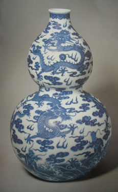 釉里红器物有各式瓶:葫芦瓶、直颈瓶、天球瓶、碗、盒等;釉里红色趋于黯淡。还有些青花釉里红器物,两种色彩对比也不如雍乾时期水平。