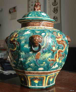 珐华釉是一种低温色釉,又称法花、法华。一般采用牙硝做熔剂,先在陶胎表面采用立粉方式勾勒出文饰的凸线或者堆贴出文饰的轮廓,然后分别以所需的彩料填底子和花纹色彩,最后入窑烧成,工艺复杂,做工精细,耗时费力,一件珐华器大件的制作至少需要一个人数月的时间才能完成。以珐华彩制作的陶瓷器称为珐华器。据《饮流斋说瓷》载,珐华釉始见于元,而流行于明,多为北方窑场烧制,通常有陶胎和瓷胎两种,陶胎多产于北方的山西一带,瓷胎珐华产于景德镇。目前很多专家认为瓷胎珐华在明代宣德年间开始烧制,事实上元代就开始烧制了,本站长就有一件至正十一年八月款的瓷胎珐华大罐。最近,本人拜访著名的文物鉴定专家孙学海老师,他说见到几件元瓷胎珐华器,比明代的制品要精细。