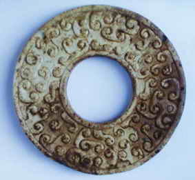 商周时期较多素环,春秋时期环常饰以繁满精美的纹饰,形制也相当规整。该陶环形制与纹饰风格,皆与春秋时期的玉环如出一辙。虽是陶器,材质不甚名贵,然从制作工艺看,构图饱满,云纹变化多端,穿插和谐,压地浮雕一丝不苟。观赏该陶环,能使人产生一种莫名的神秘与敬畏心理。