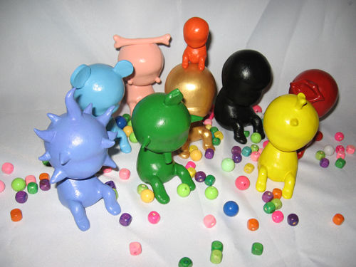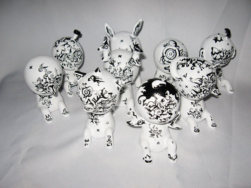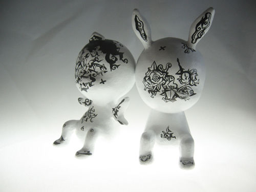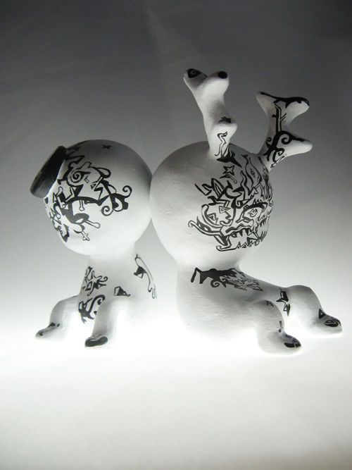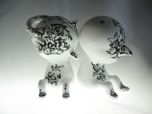 QRUWI是小不点的意思,EMBRYO寓意新生事物。“QRUWI EMBRYO”的创意来源于婴儿,9个小瓷人实际是9个被高度概括的婴儿形态,没有面部和上肢,每个小人的动态和体形都非常接近,但有的有一对兔耳、有的有天使的翅膀、有的多出一只手来,这些细微的差别又决定了它们之间的不同。