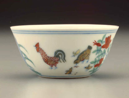 杯口微侈,壁矮,以鸡为主题纹饰,故名鸡杯,又其状似缸,又称鸡缸杯。纹饰彩绘于外壁,有鸡纹二组,以奇石花卉间隔。一组公鸡在前,昂首护卫,母鸡在后低头觅食,三仔鸡围绕在旁,张口展翅,似为妈咪觅得食物而欢呼。另一组亦采二老三少组合,母鸡振翅低头,正奋力与猎物搏斗,前立一小鸡为母加油,并作充分准备,随时可加入战阵,也许母鸡振翅奋战,惊动了在前护卫的公鸡,蓦然回首,关爱之情不言可喻,另二仔鸡则嬉戏于花丛下,怡然自得。釉上色彩有红、黄、褐、绿等,浅染深描,或是二色重迭,搭配巧妙,架构了一幅活泼生动,祥和乐利的天伦图。