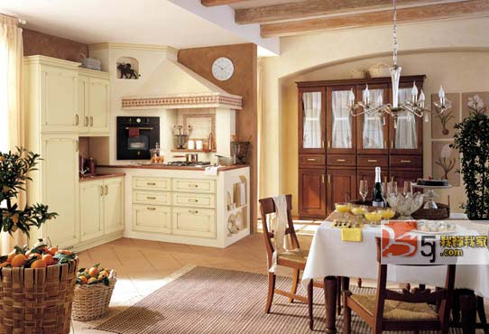 在这种色彩环境里,可以清爽为主导。乡土气息的颜色搭配让人神清气爽。相比于地面,墙面显然有更大的发挥余地,因此是最好的表现场所。图案是调制田园味道不可缺少的组成部分,精美图案的组织安排,四方联的整块使用或二方联的连续使用都会很容易被人接受。明亮的空间是让空气感到清新的重要因素,颜色含灰度不能高,要始终保持一定的亮度。而高明度的原木色或略含灰度的蓝绿色在色彩感觉上比较对味,也更适合厨房。