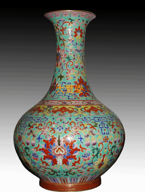 清嘉庆  孔雀蓝地粉彩花卉纹瓶,高:27.2厘米,此瓶采用了黄金线条和粉彩结合的,瓶型大方,雅观,工艺精湛。图案是莲花和蝙蝠为主题,采用缠枝和它们相连的,这是吉祥的图案,是送礼和收藏的好佳选
