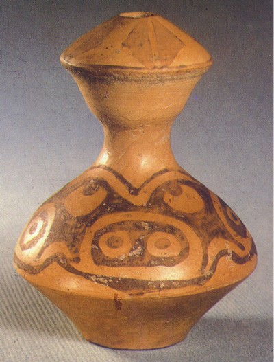 猪面纹细颈壶。半坡文化此件彩陶绘有一圈二方连续的猪面纹,连续的猪面巧妙地共用一双眼睛,成功地运用了双关装饰手法。