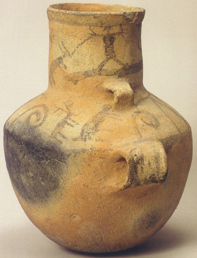 彩陶四耳壶。辛店文化长直颈,泥质褐红陶。肩部用黑彩绘鸟、兽纹样,简练概括、生动活泼。