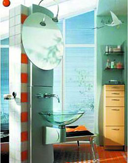 现在的卫生间不再似以往狭小和脏乱,卫浴概念也已打破陈规,转变为一种新的享受,成为现代人缓解生活压力,舒展疲惫身心的一种方式。为了突出休闲的空间特质,专门在宽大明亮的窗户边设置了卧榻,沐浴后、穿衣前,可以在卧榻上休息一会,读读报、看看天、想想心事。在色彩的处理上也是明亮的、欢快的,仿佛晴朗的夏日阳光,不带一丝忧郁。