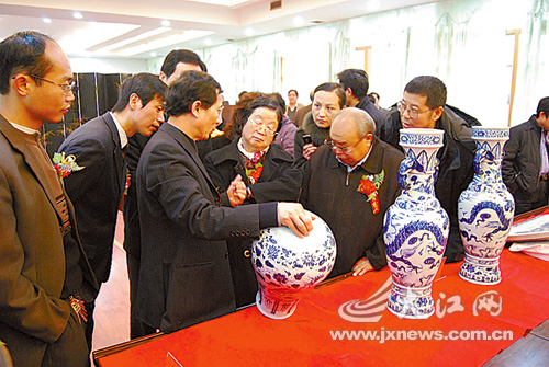 本报抚州讯 李俊、记者周文平摄影报道:身世神秘且存世稀少的元代青花瓷器,是我国陶瓷文化的一朵奇葩。27日,元代青花瓷器研究课题论证会在抚州举行,30件元代青花瓷公开亮相,吸引了首都博物馆原馆长马希桂、中国古陶瓷研究会副会长、故宫博物院研究员李辉炳等全国10余位专家到来。