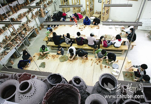 在江汉大学陶艺馆老师的指导下,小“留学生”们将手中的黄泥捏成笔筒、房子等各种形状。有的孩子还顽皮地将黄泥抛来抛去,弄得浑身是泥,教室里笑声不断。