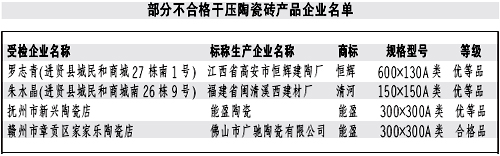 本报讯记者龚汉斌报道:近日,省质监局公布了近期对干压陶瓷砖产品进行省级产品质量监督抽查的结果。质监部门共抽查了51家生产企业生产的52批次产品,抽样合格率90.4%。抽查结果表明,本次抽查的陶瓷砖其放射性核素限量指标均达到了标准规定的要求;但仍有部分产品存在一些问题。