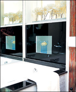 值得借鉴的地方:浴缸的一面墙改为装饰墙,里面安放了一些插花,使卫生间里保持自然的气息,可以从卫生间外面随时更换插花,很有创意也非常方便。