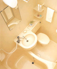 装饰特点:在极为窄小的空间里,可以实现最多功能。如果卫生间很小,一般摆放浴缸是不可能的,但整体预制型卫浴利用铸模的优势解决了这个问题,浴缸在长度的限制下尽量做宽,盥洗池和马桶为一个整体,这样,水箱的位置可以做一个放置物品的台面。