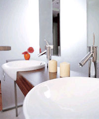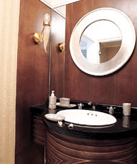 整体风格:因为卫生间本身不大,所以这套卫生间的墙面采用了高反光的玻璃材质,地面也用了高抛光的瓷砖,配合以明亮的灯光,卫生间看起来大了不少。不锈钢的面盆、龙头、透明的淋浴间使整个卫生间极富现代感。