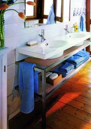 翻翻家居杂志,今年卫浴的变化最明显就是体现在墙面上,具有感情色彩的暖色调的防水墙漆、雍容淡雅的防水壁纸,还有那些天然的原木色板材,正逐渐使浴室呈现出迥然不同的风情。其实,要想达到这样的装饰效果并不难,只要认识一些新材料就可以轻松操作了。