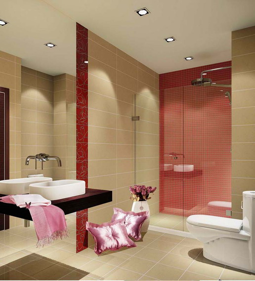 把盥洗区安排在正对着浴室门的位置,这样既美观又能突出浴室的风格,所以主题墙的作用就相当重要,也是浴室风格的有力代言。红色烤漆的浴室家具将女性主张表露无疑,为了使风格更加精致,铺贴白色Art Deco风格的瓷砖来烘托气氛,塑造浴室的小资情调。