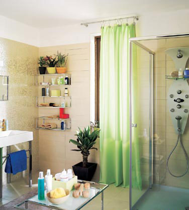 卫生间选择不同颜色的窗帘,可以营造出不同的空间效果。绿色的窗帘让白色卫生间感觉更加清新,也让整个环境的氛围更加清透,又能中和金色马赛克墙面张扬的个性色彩,让卫生间更具令人身心愉快的生活气息。