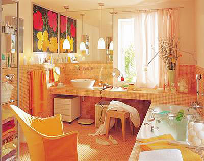 面积稍小的卫浴间,由于空间比较局促,无法安排下淋浴房或浴缸,一个简单的淋浴花洒即构成淋浴区,即便如此,这个简单的小淋浴区也同样可以使用彩砖+花砖的办法,亮丽起来。
