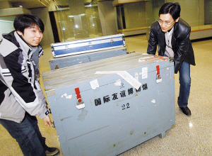 昨天下午1时许,在工作人员严密押送下,4个装载着国礼珍品的密封箱运抵周邓纪念馆院内。还未见珍品,那些专门为展品“量身定做”的箱子就让人很感兴趣,每个箱子都有1米多高,由于展品极其珍贵且是易碎品,在包装时里面不仅加了防震的材料,箱子外面也特别注明易碎标志,每一件珍品都被固定在专门的锦盒中,且是根据它们的大小和形状量身定做的。